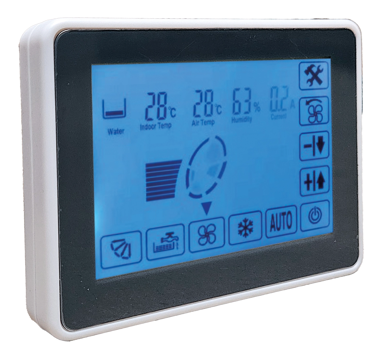 L’écran de contrôle affiche en temps réel le niveau d’eau, la température ambiante et la vitesse de ventilation (jusqu’à 12 niveaux réglables), garantissant une gestion fine du confort et de la consommation énergétique.