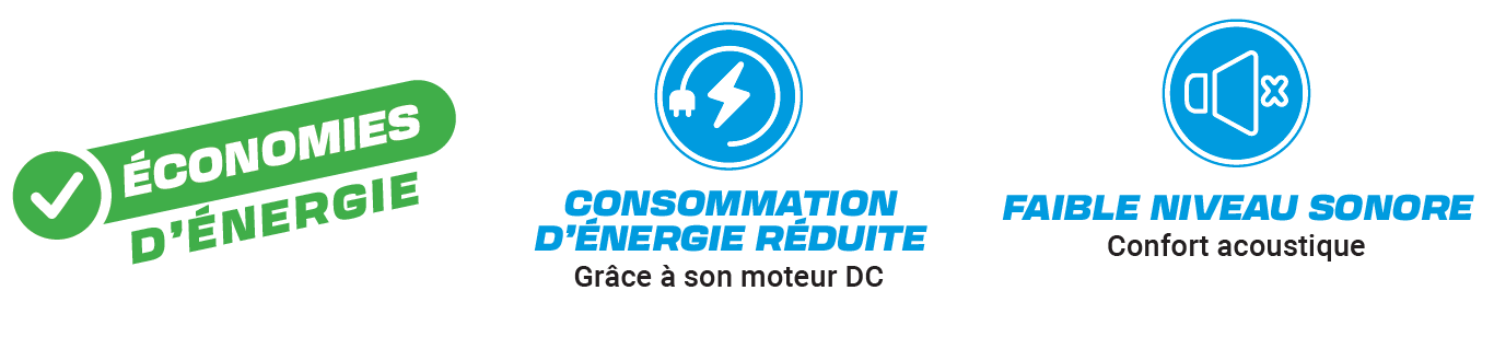 Cette technologie assure également un fonctionnement fluide et stable, limitant les vibrations et le bruit. Le résultat est une ventilation plus silencieuse et plus durable, idéale pour les espaces publics ou zones de travail sensibles au bruit. En résumé, le moteur DC combine économie, confort et fiabilité au quotidien.